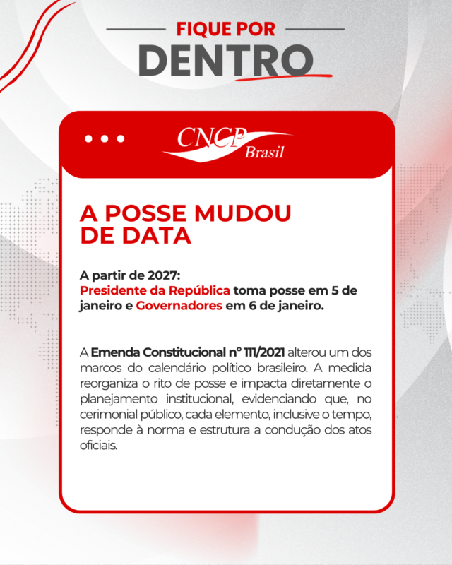 28 abr Agência de notícias, CNCP Brasil, Nacional Alteração no calendário de posse reorganiza a dinâmica do Cerimonial Público no Brasil 28/04/2026 Por Vitoria Bezerra Uma mudança promovida pela Emenda Constitucional nº 111, de 2021, introduz u...Continue lendo